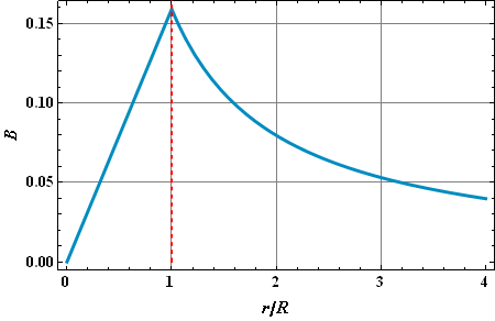 Let us plot magnetic field inside and outside a wire as function of the distance r from the center of wire.