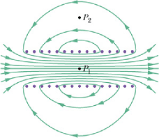 Following figure shows a vertical cross-section through the central axis of a stretched out solenoid. Magnetic field lines of a stretched out solenoid.